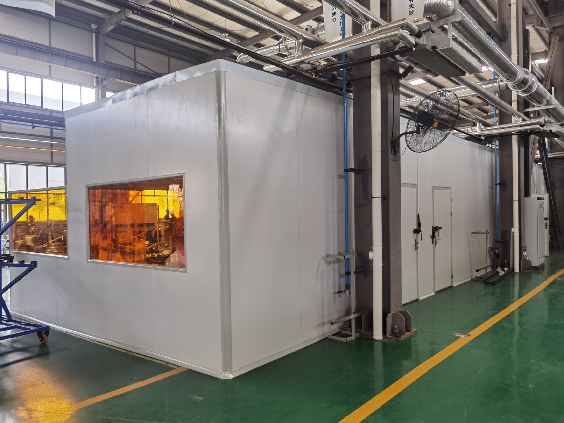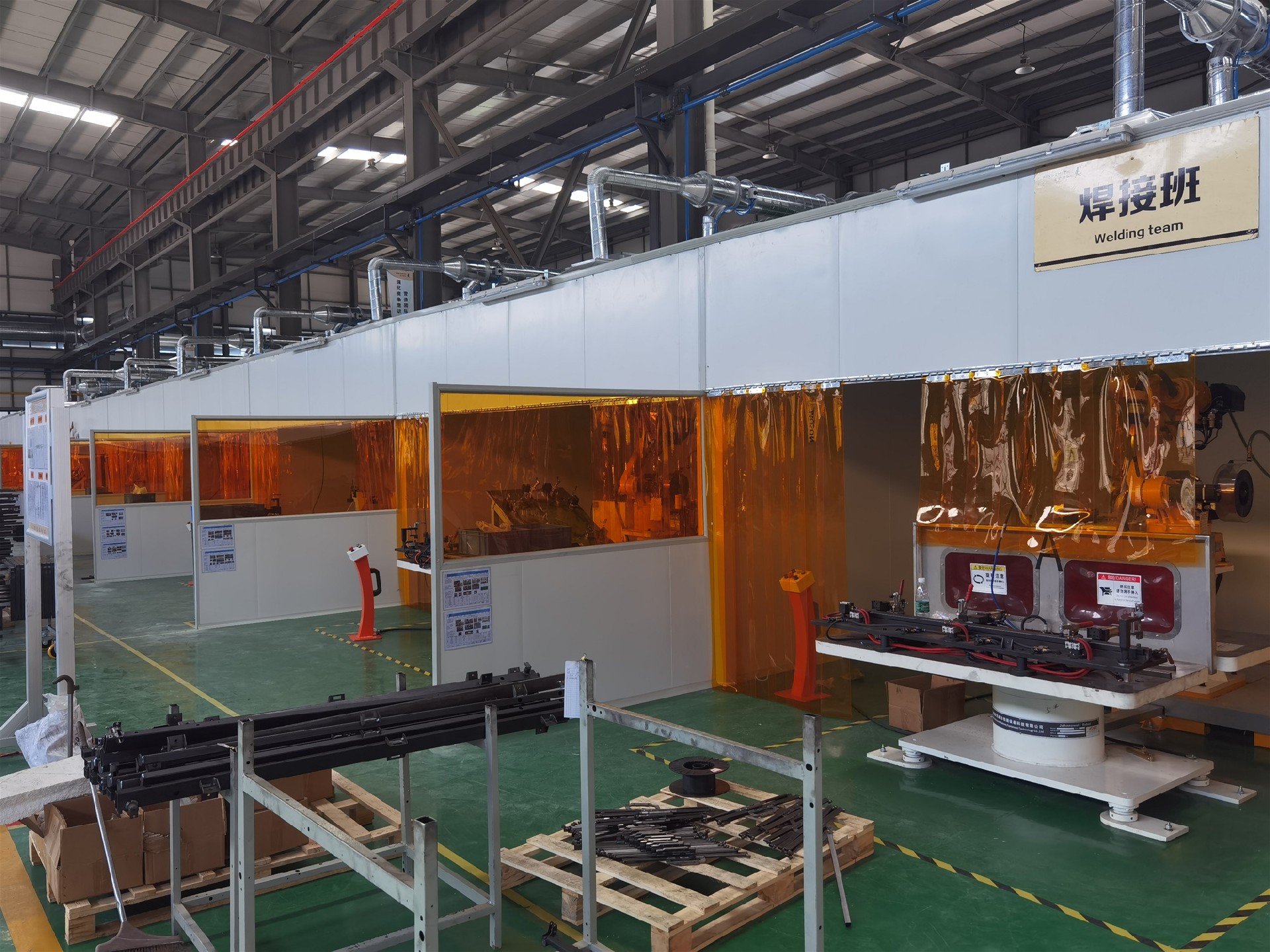 現(xiàn)場車間共有8個焊接工作站需要煙塵凈化處理,在焊接工裝平臺中心處,安裝遮擋弧光的軟膠簾,膠簾從離地面2米高度垂下,膠簾下擺根據(jù)工裝平臺的形狀仿形剪切,下擺距離工裝或地面縫隙不大于10mm,膠簾交錯層疊安裝,兩條膠簾之間的層疊區(qū)長度不低于30mm;使焊房處于相對密閉的空間,焊接煙塵不外溢。各焊房上料區(qū)之間安裝隔斷墻,隔斷墻腰線高度1米,腰線以下采用凈化板材質(zhì),腰線以上采用金屬框架和半透明擋光材料。各焊房上料區(qū)有獨立的空間,并且保證了外觀的整齊劃一。