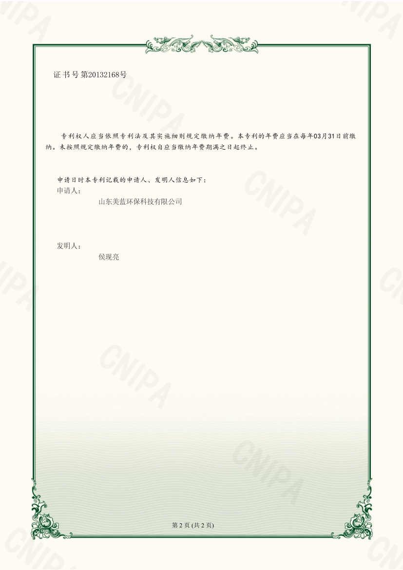 實(shí)用新型專利證書-一種便于清理的濕式除塵器